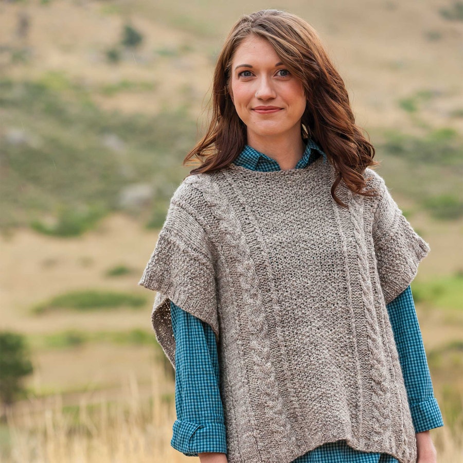Melanie Smith spun a three-ply yarn from a white/gray blend of Bluefaced Leicester to create a subtly marled yarn for this poncho. Although it's written as a one-size-fits-most pattern, you'll find instructions for sizing it up or down according to your preference.