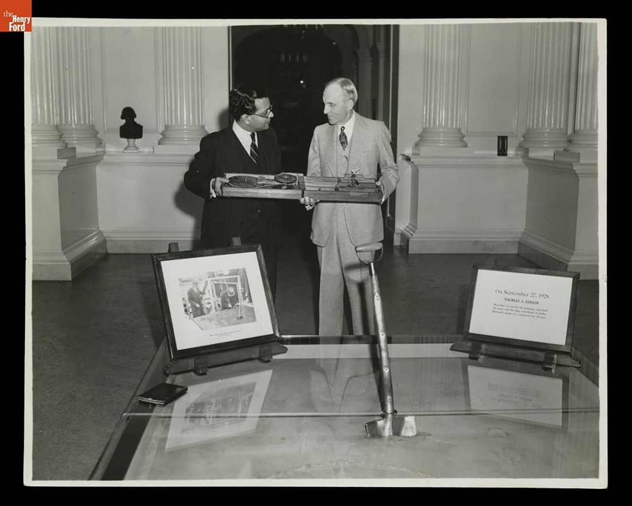 Mr. T.A. Raman Presents a Portable Spinning Wheel to Henry Ford, a Gift from Mahatma Gandhi, 1942. From the Collections of The Henry Ford. Gift of Ford Motor Company