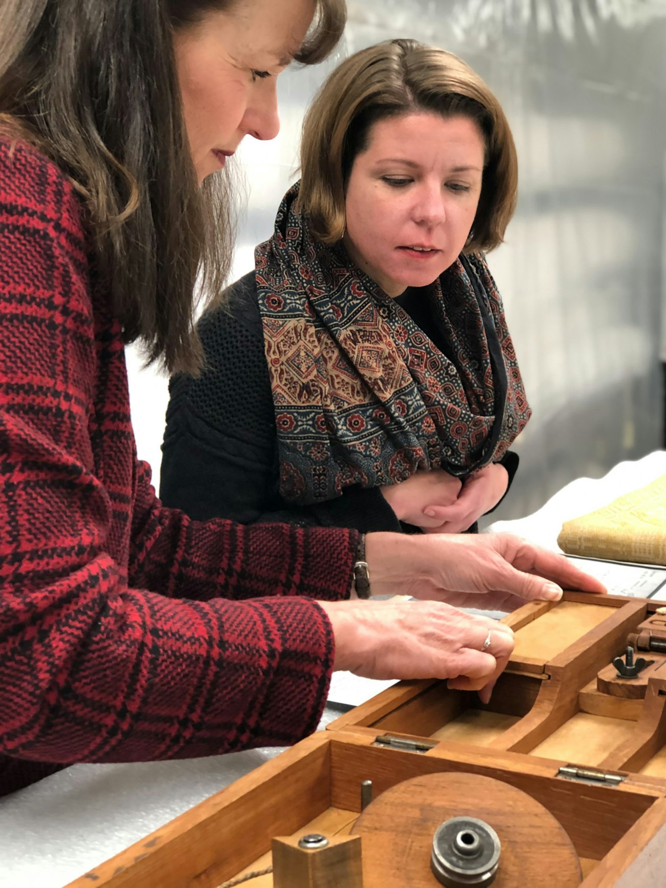 Jeanine Head Miller (left), Curator of Domestic Life at The Henry Ford, opens the charkha’s storage compartment to reveal yarn samples. Spin Off Editor Kate Larson does her best to look and not touch. Photo by Joan Sheridan, used with permission from The Henry Ford
