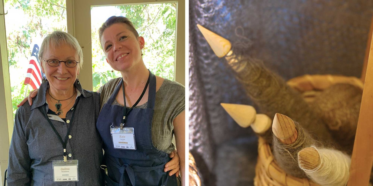 Spin Off editor Kate Larson chats with Galina during the 2021 SOAR event (left); courtesy of Tiffany Warble. A sampling of spindles from Galina’s class, Supported Spinning in the Orenburg Way (right); courtesy of Long Thread Media.