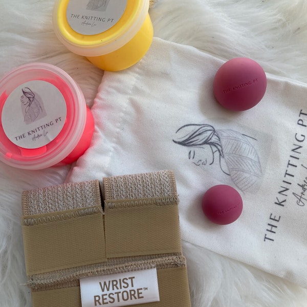 One of the most common questions asked was how to stretch the hand, which is difficult to stretch due to the nature of the short and strong muscles within. I spent some time searching for firm massage balls, but many of the ones on the market are too soft for my liking. Once I got the idea to begin to source my own massage balls, adding TheraPutty for strengthening was a perfect complement to provide a holistic experience for the hands and wrists. The kit was designed this way to provide a way to strengthen and stretch the hands and wrists. The Wrist Restore brace is a brace I have used for years in my professional work as a physical therapist, so I knew it well and had found it to translate well for adding extra stability for handcrafting.