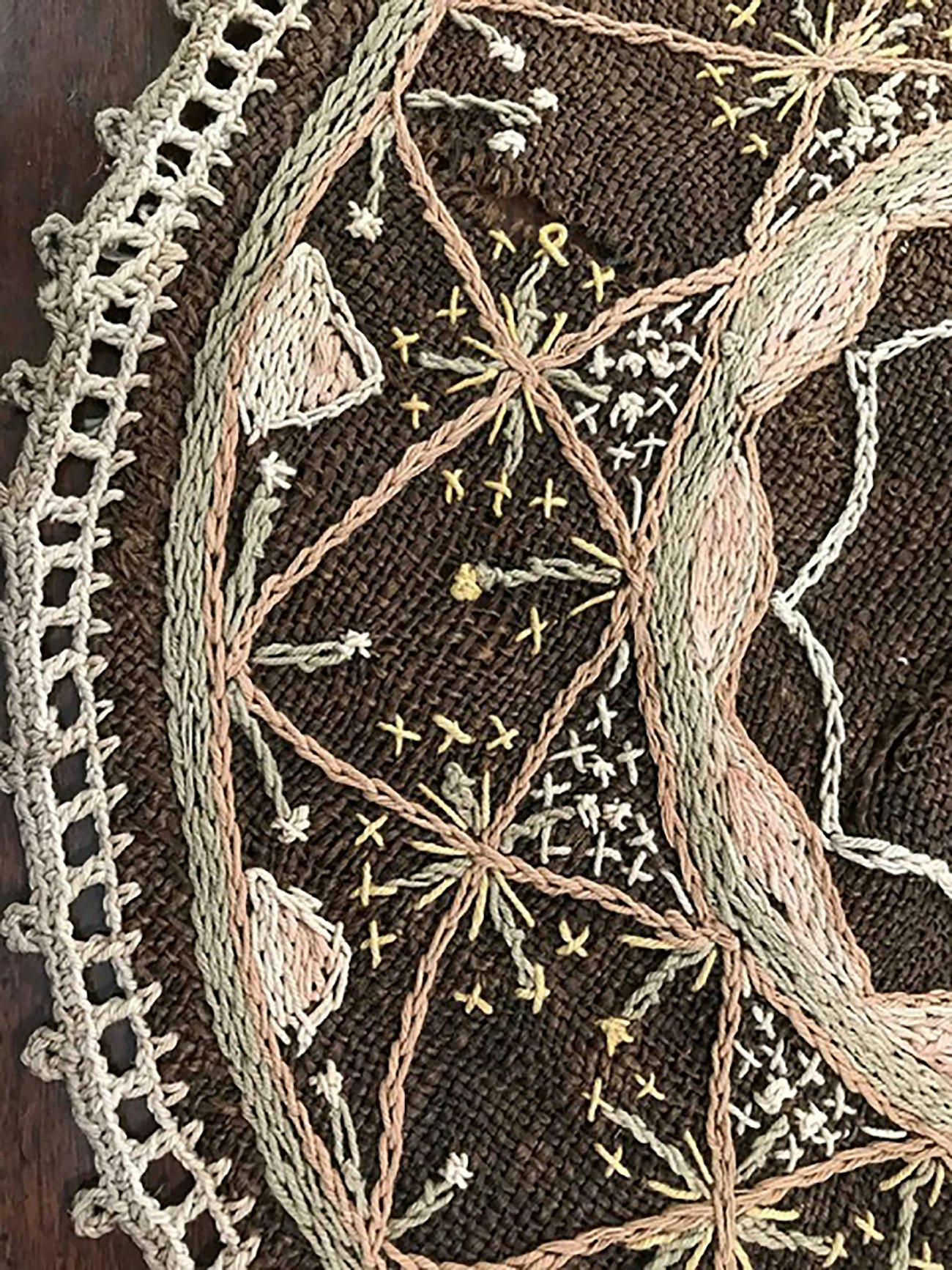 Detail of a round burlap doily used as a model in Carver’s agricultural extension work. Photo by Nancy Nehring. Image courtesy of National Park Service, Tuskegee Institute National Historic Site, George Washington Carver Museum