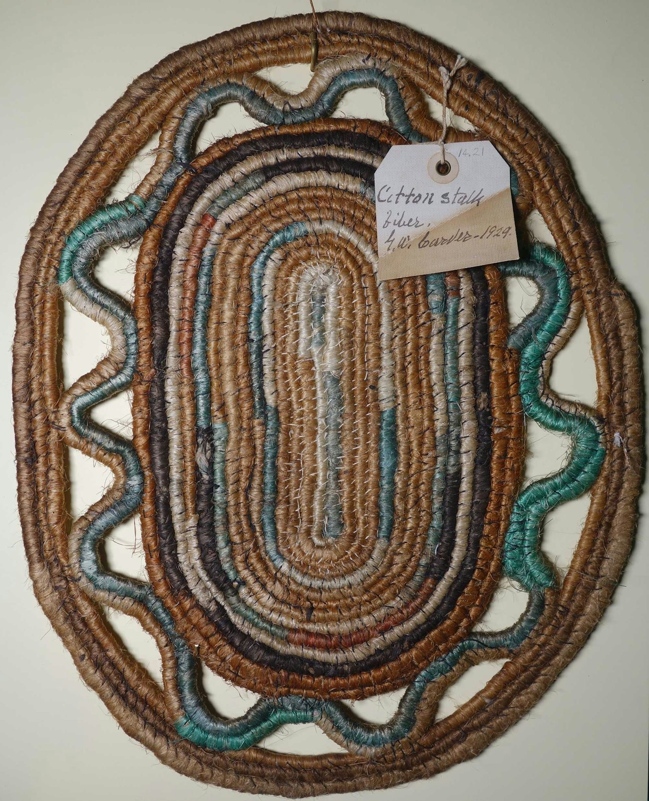 Coiled mat made from dyed cotton-stalk fiber. Label with Carver’s signature reads, “Cotton stalk fibers. G. W. Carver - 1929.” Photo by Curtis Gregory. From the collection of George Washington Carver National Monument