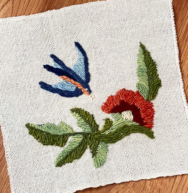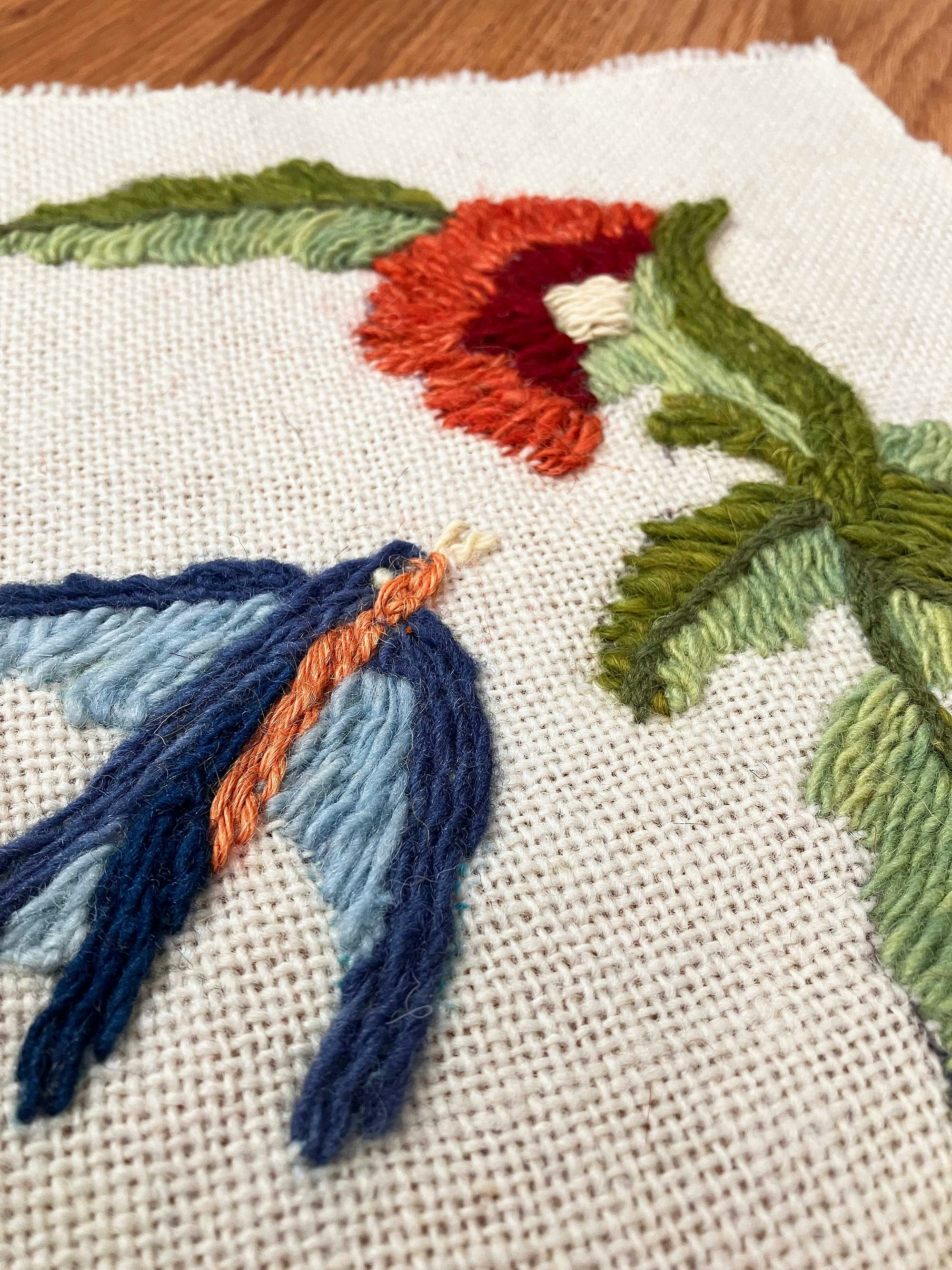 Julia teaches traditional colcha embroidery, meaning this couching stitch is worked on sabanilla cloth, woven from wool, using hand-spun and naturally dyed yarn from Churro fleece (and all without the aid of an embroidery hoop). What I loved about working the colcha stitch was that it was a bit freeform in nature and I could fill in each motif fairly quickly, tacking long sections of yarn to the fabric using small, repetitive stitches.