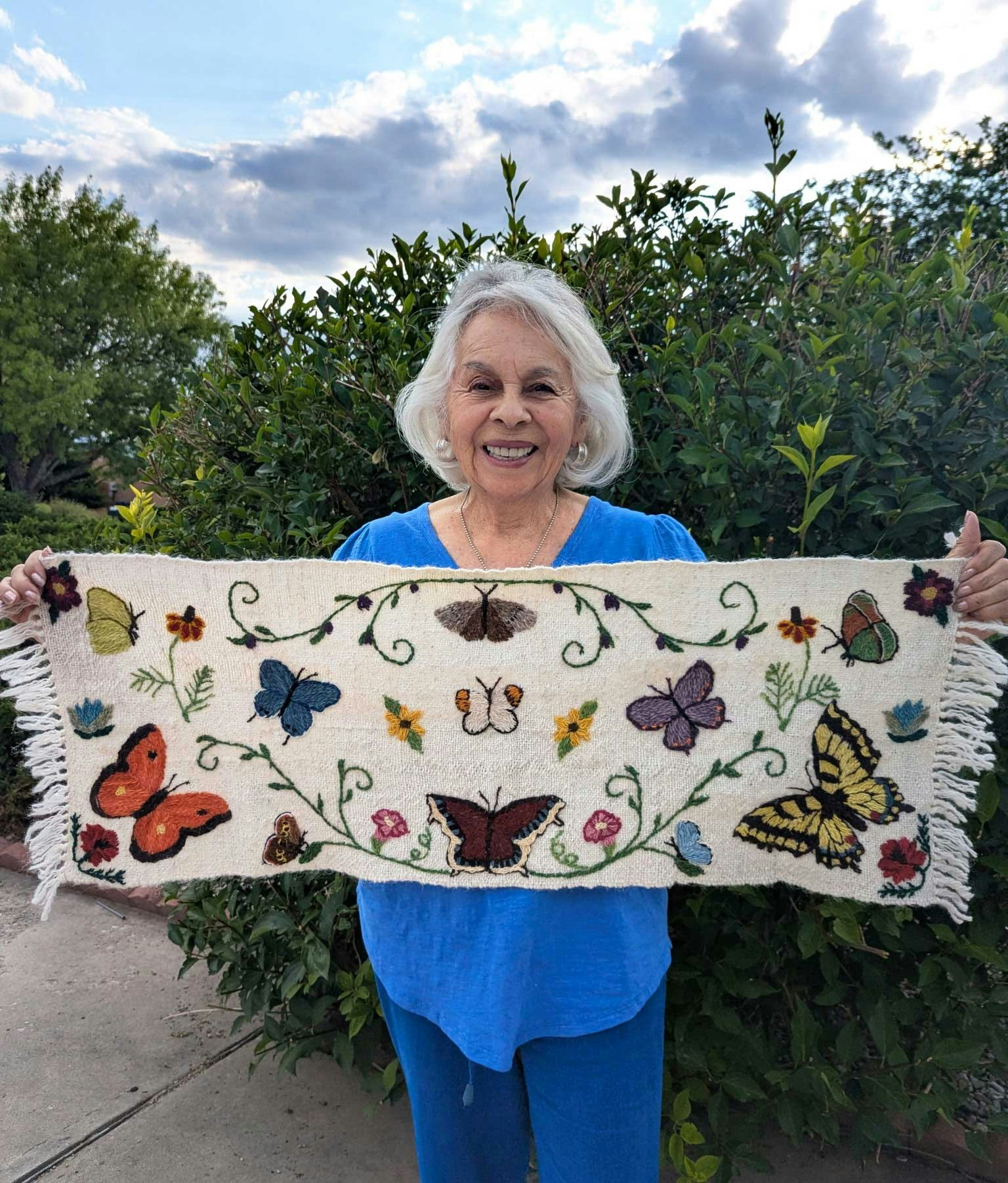As we sat meditatively stitching away, Julia talked about the history of colcha embroidery, the Churro sheep, her three decades teaching in New Mexico’s public schools, and her recent trip to Washington D.C., where one of her embroidered pieces was selected for a special exhibit at the Smithsonian American Art Museum through September 2026. I’m excited to have found a new passion where I can use my small bits of handspun to add decorative elements to pillows, shawls, and more.