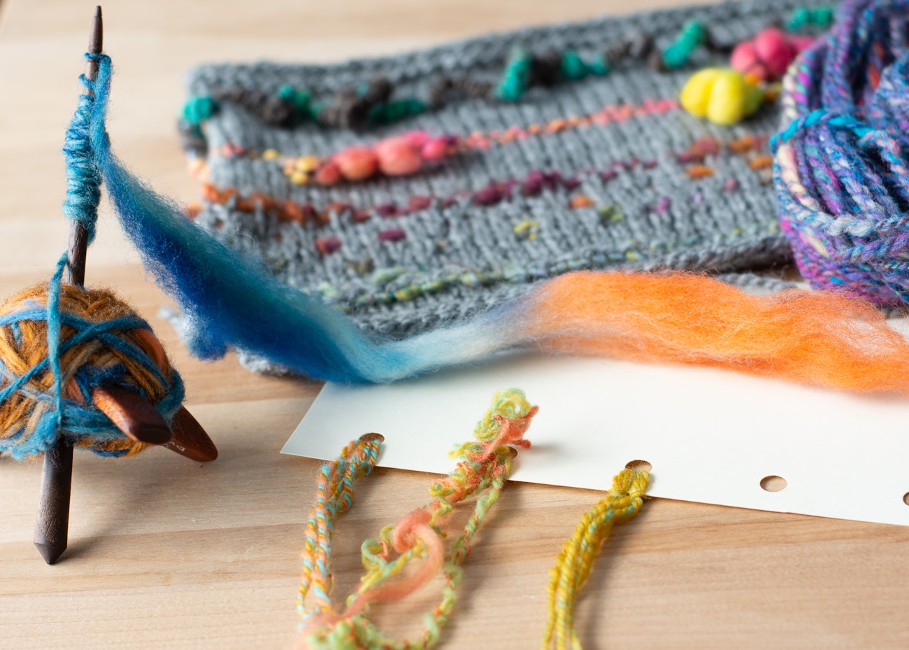 Besides the opportunity to hang out with other spinners for a week, one of the great things about SOAR is how much variety there is in the classes from year to year. This year, I enjoyed learning about new yarn structures, first in Kate Larson’s intensive, Sweet Feet: Spinning for Socks, then enjoyed learning new plying techniques like ply on the fly with Amelia Garripoli’s sampler, Spindles Can Ply! And like, so many others, I was blown away by the possibilities Charan Sachar presented in his sampler, Creative Knitting with Art Yarns.