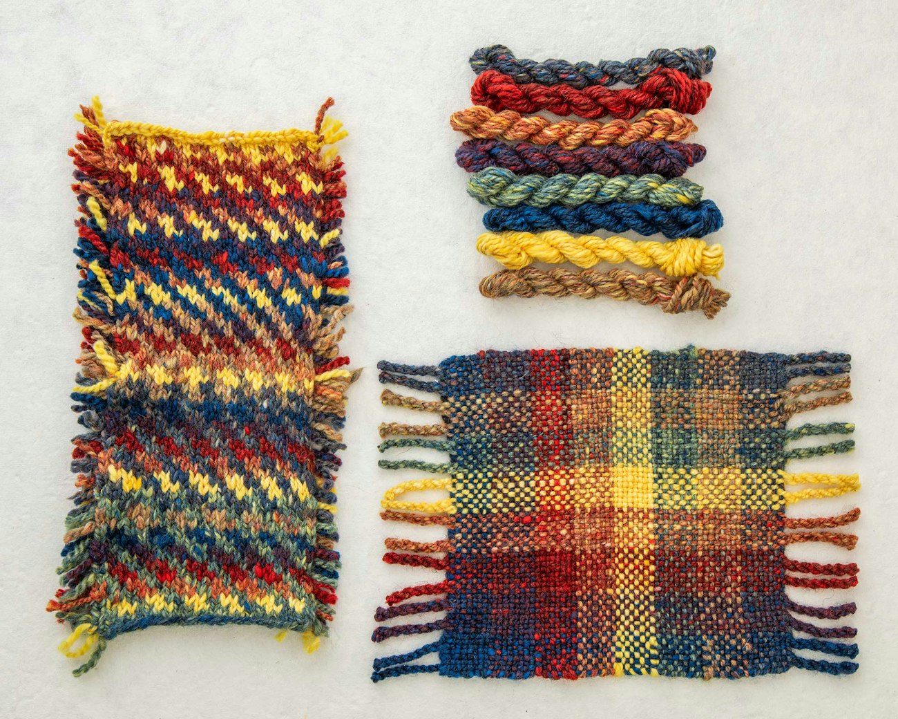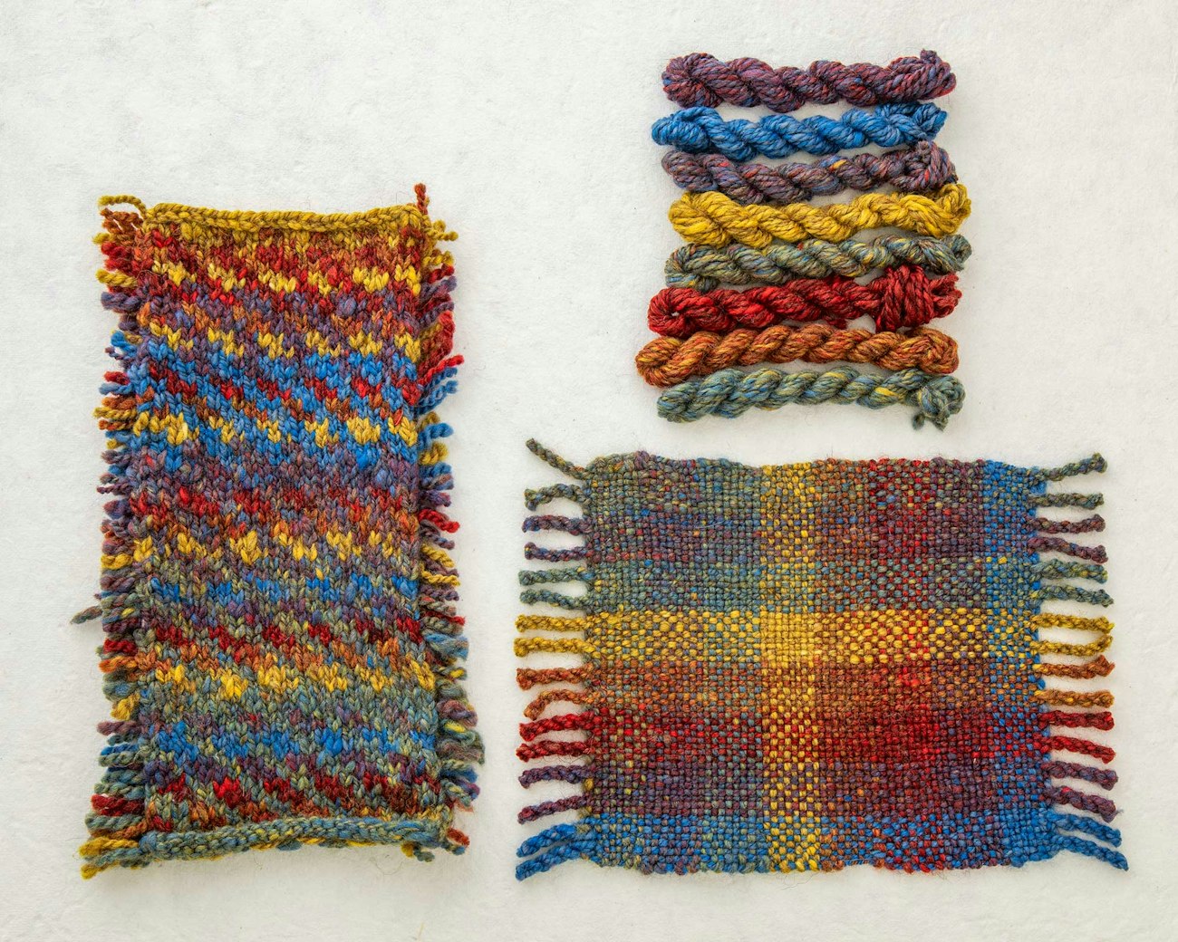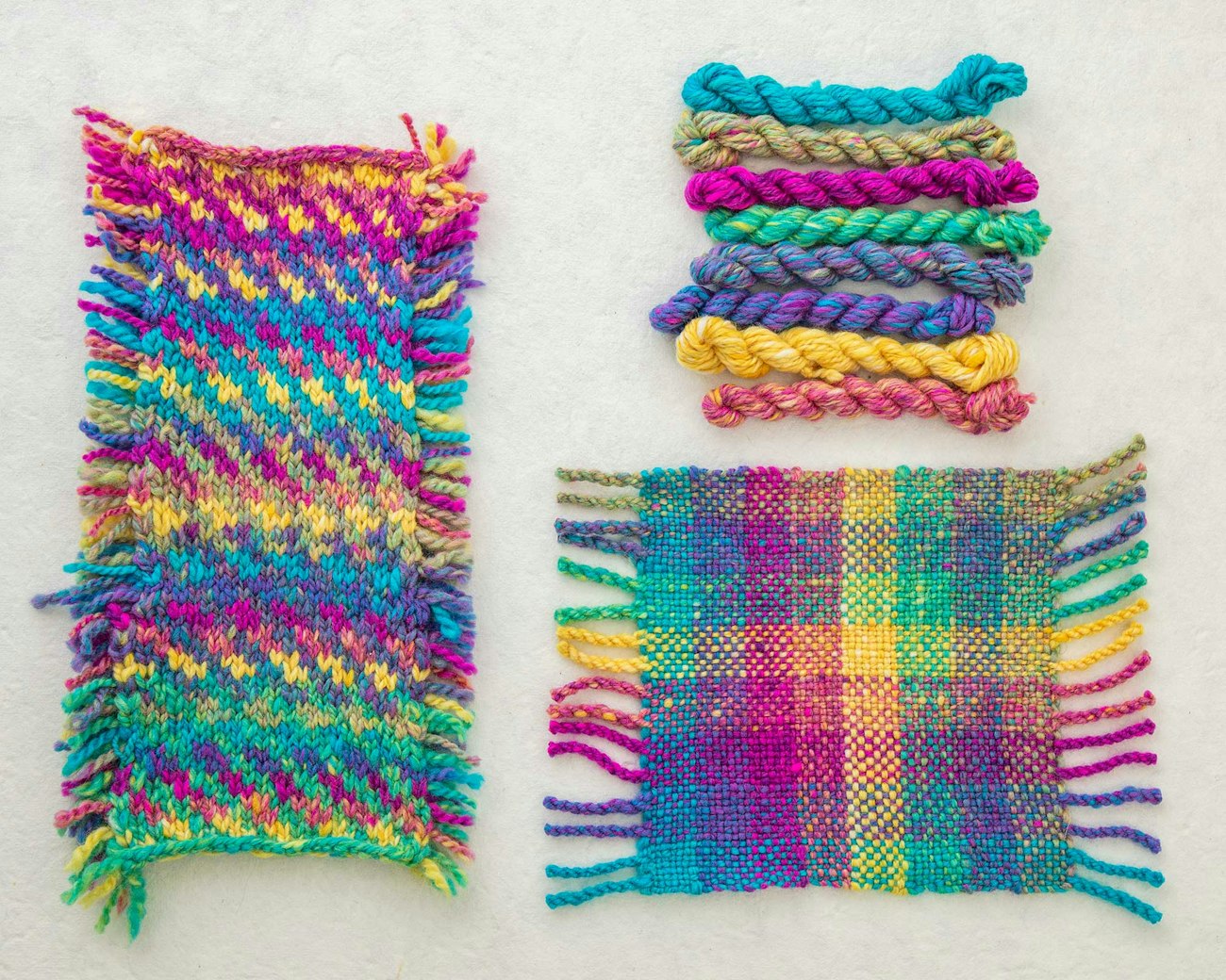 But a new set of color wheels wasn’t the end goal. I also needed to know how those new colors would interact with each other in order to start planning projects, so it was time to sample. Knitting and weaving are two of my favorite crafts—after spinning, of course—so I set out to make a knitted and woven sampler of each colorway.