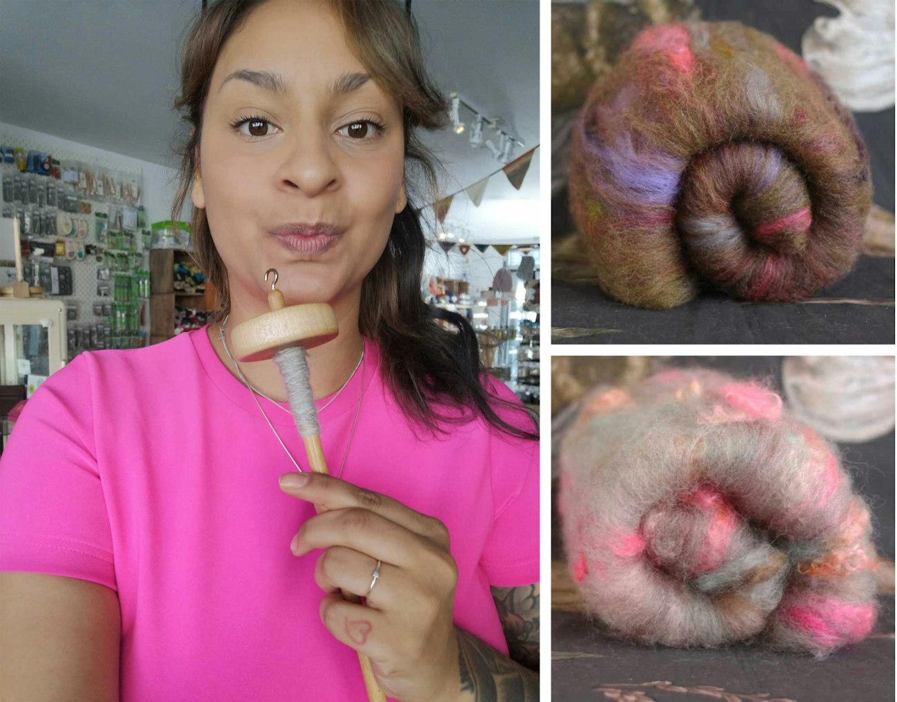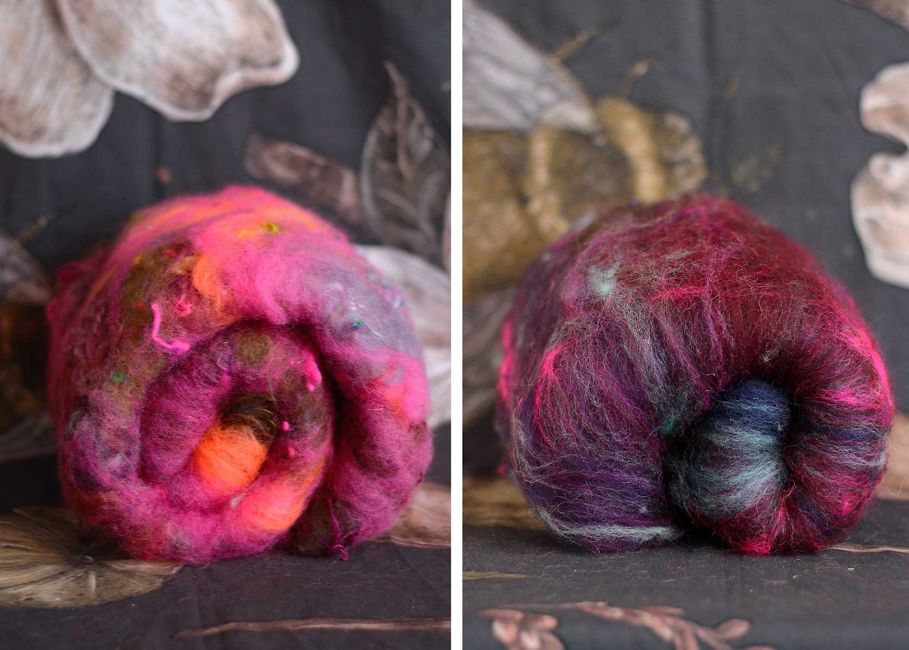 Over the last years, I fell into the world of spinning and carding fibers, and I mainly see this as another way to play with color. Fiber is the medium that I chose to specialize in, but color is and will always be my first love. I really enjoy how diverse the fiber world can be. Whether it’s yarn for knitting, threads for embroidery, or fiber for spinning, I love to work with it all. I especially love the work others such as Mapi, Urso, and A Lair Artifacts bring to the spinning community here in Quebec. They each have a unique sense of color, and I love to include their works in my carding or spinning creations.