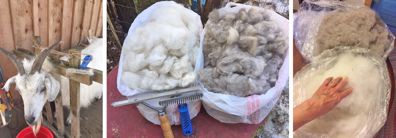 Like our wild mountain goats, my cashmere-type goats start to lose their undercoat in the spring from late April to May. That’s when I coax them onto a stanchion with a bucket of grain to keep them happy. I then start combing them using wide-toothed dog-hair combs. The hair around the neck and front haunches is the softest and longest so I concentrate on that.