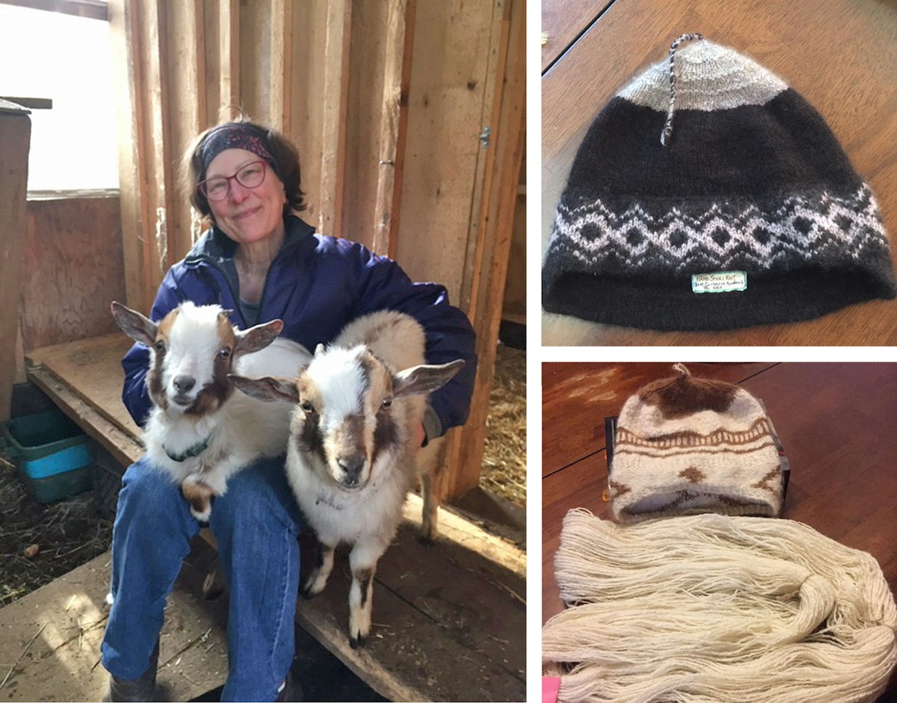 Therese with two of her kids, plus some of the hats she has made with fiber from her goats. Photos by Therese Lewandowski