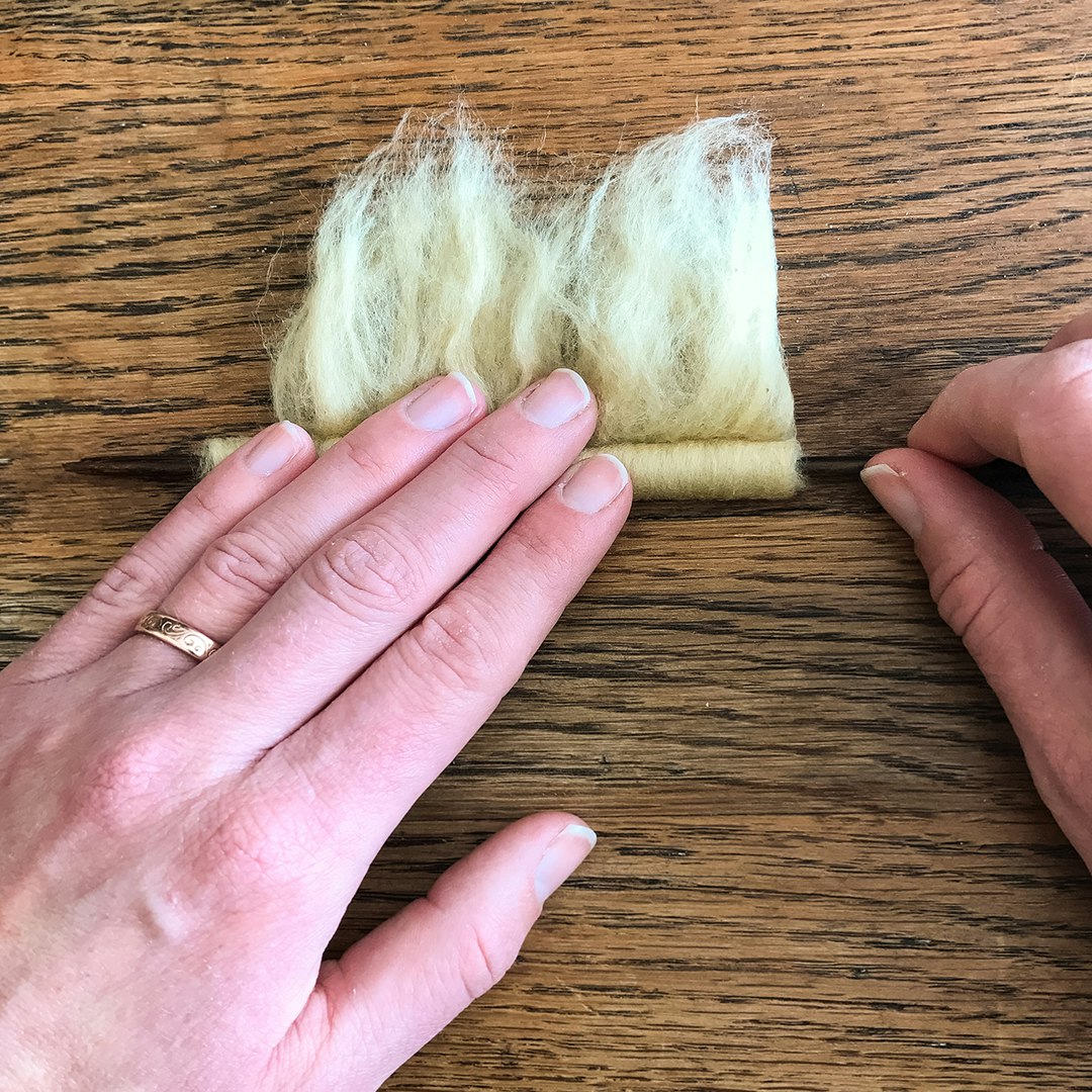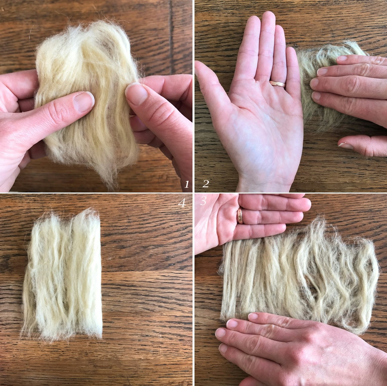 1. I start by gently opening and unrolling a 5" chunk of sliver. With patience, this will look like a flat sheet of fiber.