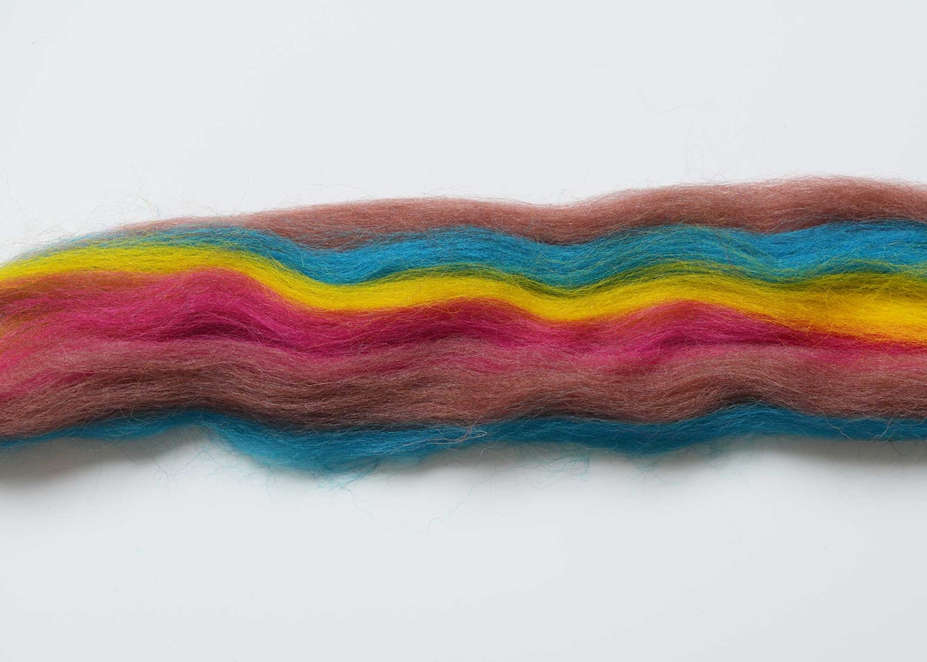 After the first gill, the component colors are clearly visible and could be separated by hand easily. By the second gill, the colors have become much more blended. You may also see this type of fiber referred to as “humbug.”
