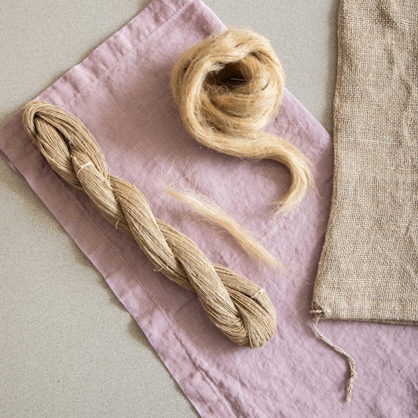 Flax roving is a commercially processed and readily available form of flax. Unlike the long line fibers associated with flax stricks and fine linens, flax roving is shorter—around 6–8 inches—and comes in a one-inch thick coil of roving from several manufacturers. It’s perfect for your more workaday items, like grain sacks or bread bags. Take a look at the images below to compare flax stricks (long line fibers) and flax roving (shorter fibers).