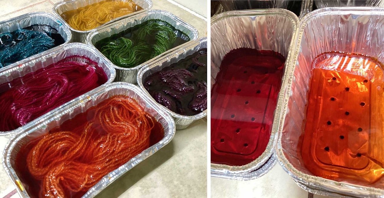 I could fit six mini loaf pans in my thrift-store roaster oven, so this determined the number of skeins I could dye at one time. Because the small pans require little water for the skeins to move around in, the resulting skeins can be a bit semisolid. You may want to try using a different heat source, larger vessels and skeins, or different dye products, but this method can be a platform for you to develop your own technique. *Left: Susan used mini loaf pans to create many dyebaths at once. Right: A second pan placed on top of the first held the skeins down while still allowing the bath to circulate. Photos by Susan Z. Douglas*Susan’s Supplies and Equipment