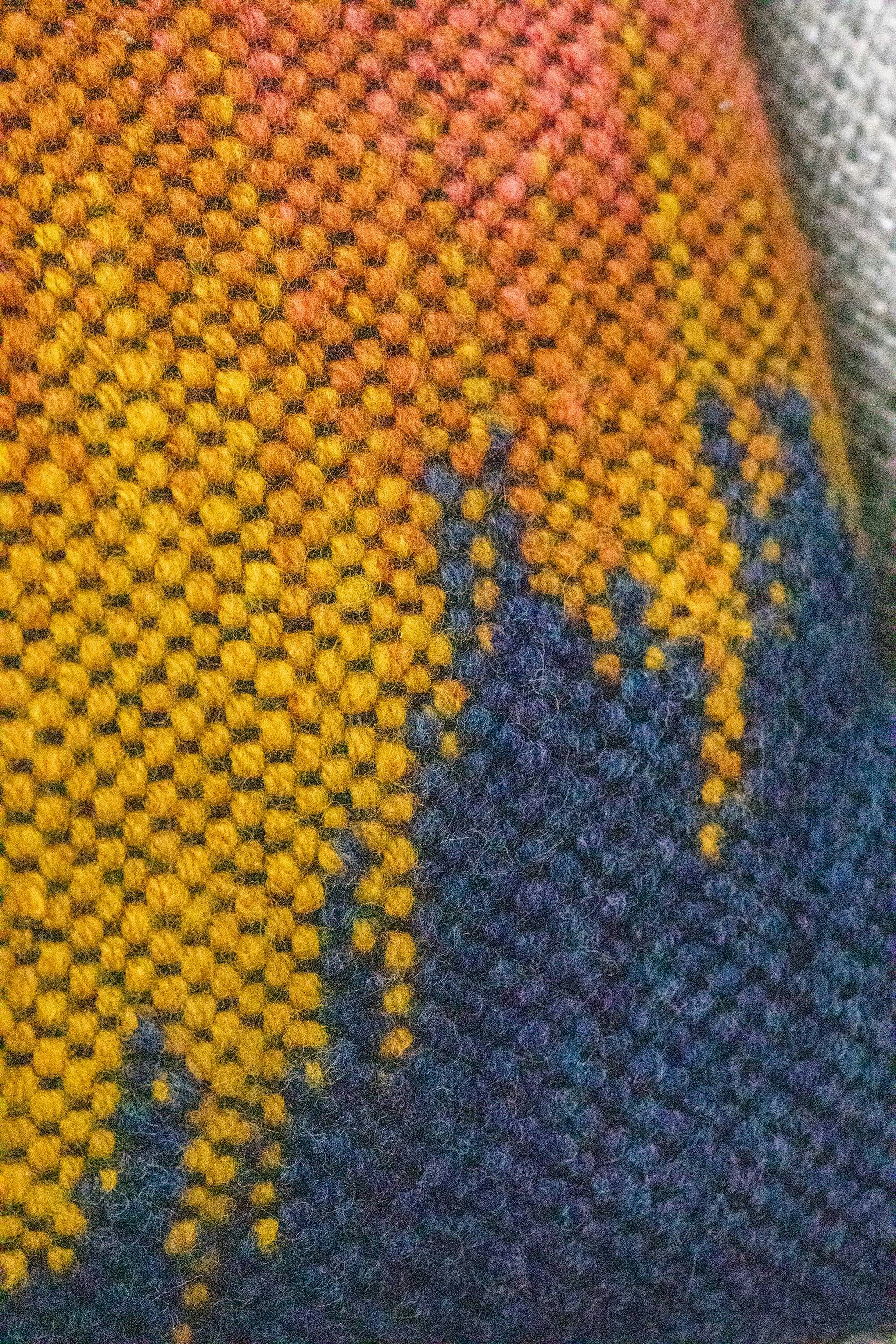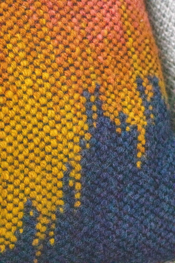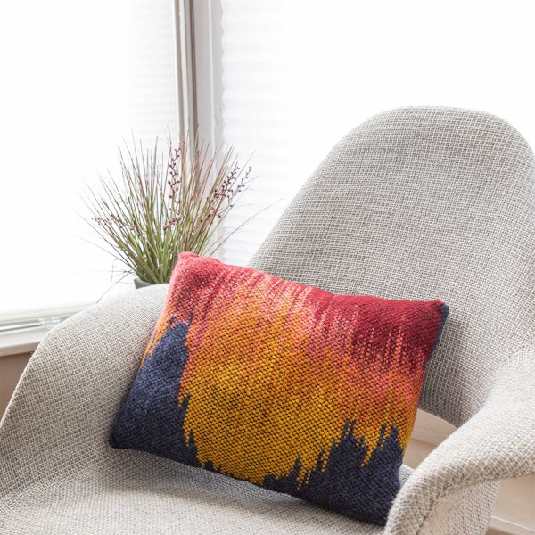 In knitting and crochet, planned pooling is where a skein of yarn is space-dyed in a specific pattern so that when you work a particular number of stitches, the colors “pool” together and create a pattern—magical! Using this method, my plan was to start with a beautiful sunset photo, design a weaving draft, and spin a yarn for the weft that would magically change colors as I wove to pool into my desired sunset. As I set out to do some weaving math, I quickly dialed back my ambition and decided the mountain part of this sunset scene needed to be its own yarn; this meant I could spin the sunset of my dreams. Clasped weft offered the perfect weaving solution, allowing me to create an undulating transition between mountain and sky as I wove.