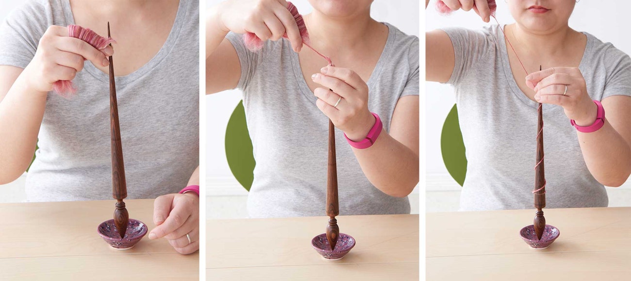Left to right: Start spinning a leader by impaling the fiber over the tip of the spindle. Gently draft back with the fiber hand, add some twist, and repeat to build the leader. When the leader is long enough, slide it down the shaft and spiral it up to spin normally. Photos by Joe Coca/Donald Scott