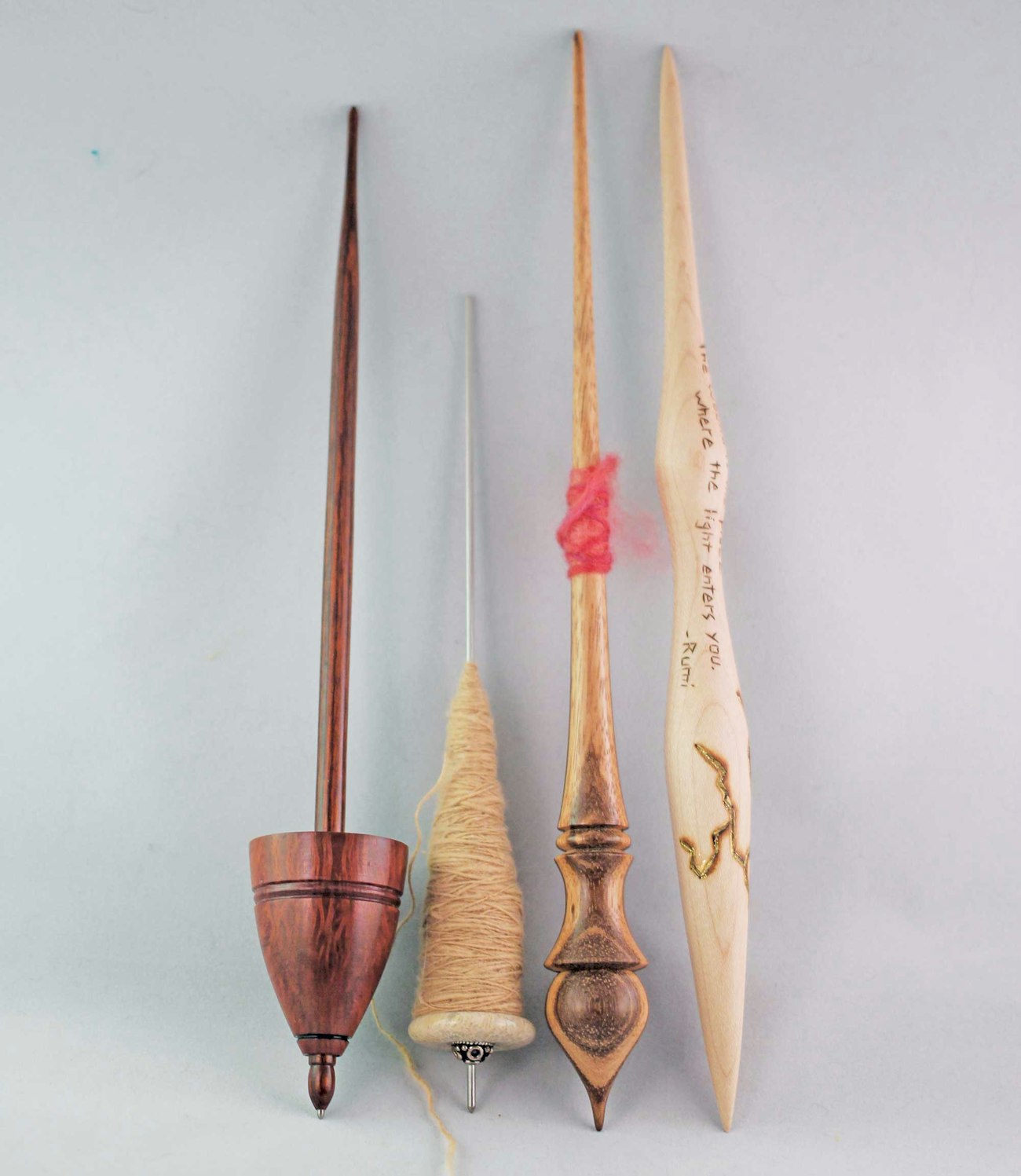 A few of Sukrita’s supported spindles; left to right: Tibetan-style, takli, Russian-style, and phang. Photo by Sukrita Mahon