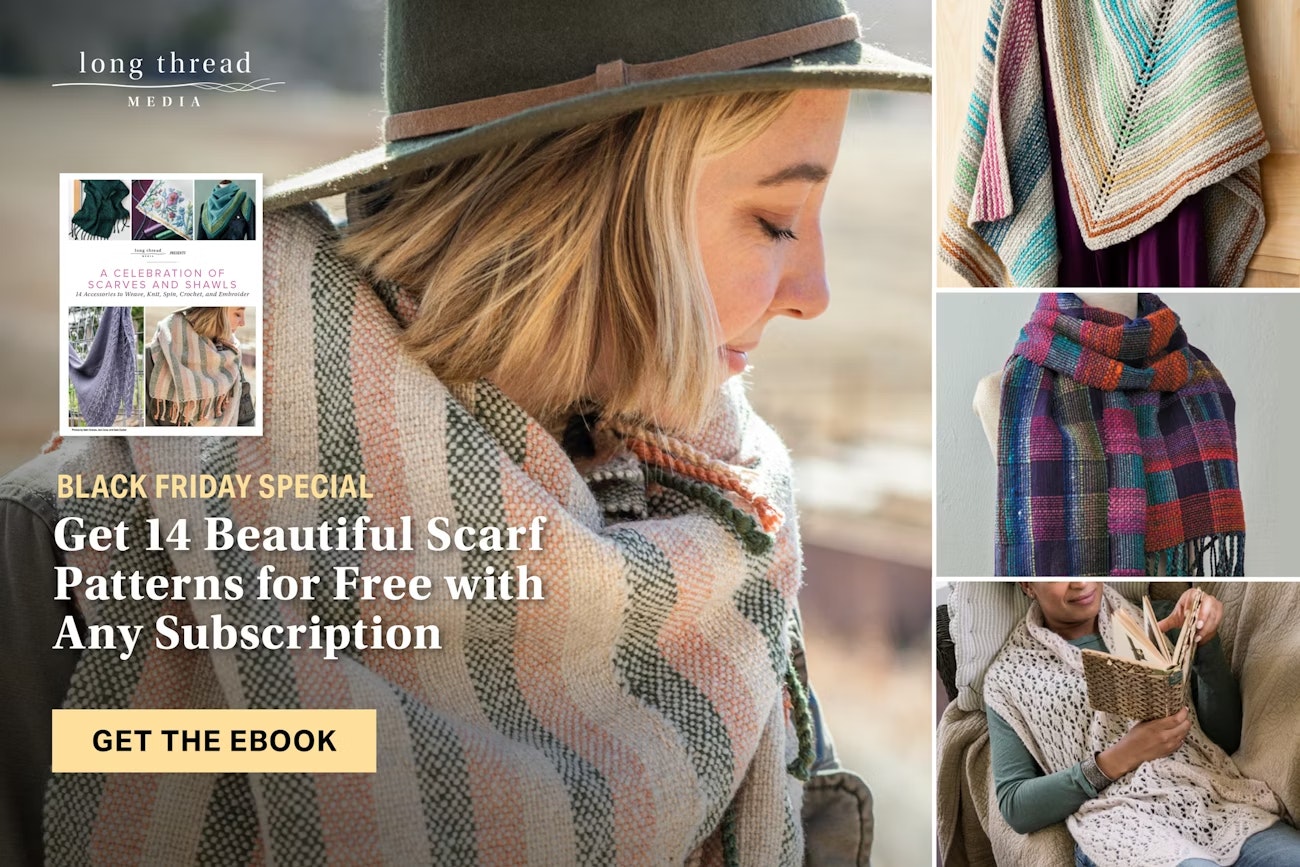 All the other editors here feel the same way about scarves, which is why we worked together to create our new eBook A Celebration of Scarves and Shawls: 14 Accessories to Weave, Knit, Spin, Crochet, and Embroider. This new eBook features projects from back issues of Spin Off as well as Handwoven, Easy Weaving with Little Looms, PieceWork, and Farm & Fiber Knits. The projects cover a variety of fiber techniques, including knitting, crochet, and weaving.