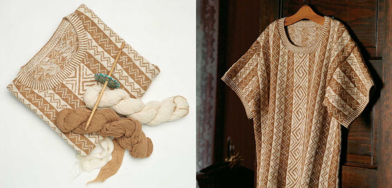 Designer Jill Holbrook finds that cotton is the most comfortable fiber to wear year-round at her home in the Southwest. So she designed the Mimbres Tee, a soft, loose T-shirt style sweater that’s easy to knit and comfortable to wear in hot climates. Inspired by the Native American and prehistoric art that surrounds her home, Jill’s design includes motifs from Mimbres pottery and is knit using brown and white cotton. Find the pattern in the Winter 2004 issue of Spin Off.