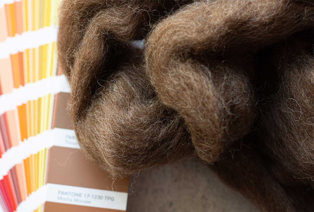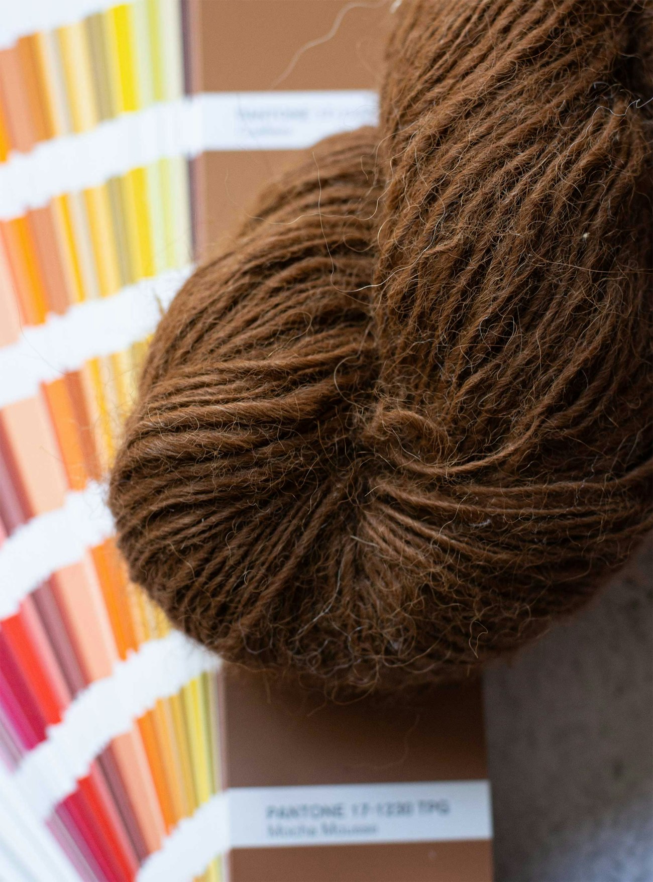 Alpacas come in a beautiful rainbow of colors, including a coppery brown that's a beautiful match for Pantone’s Mocha Mousse. Soft, warm, and drapey, it would make a lovely scarf or blanket.