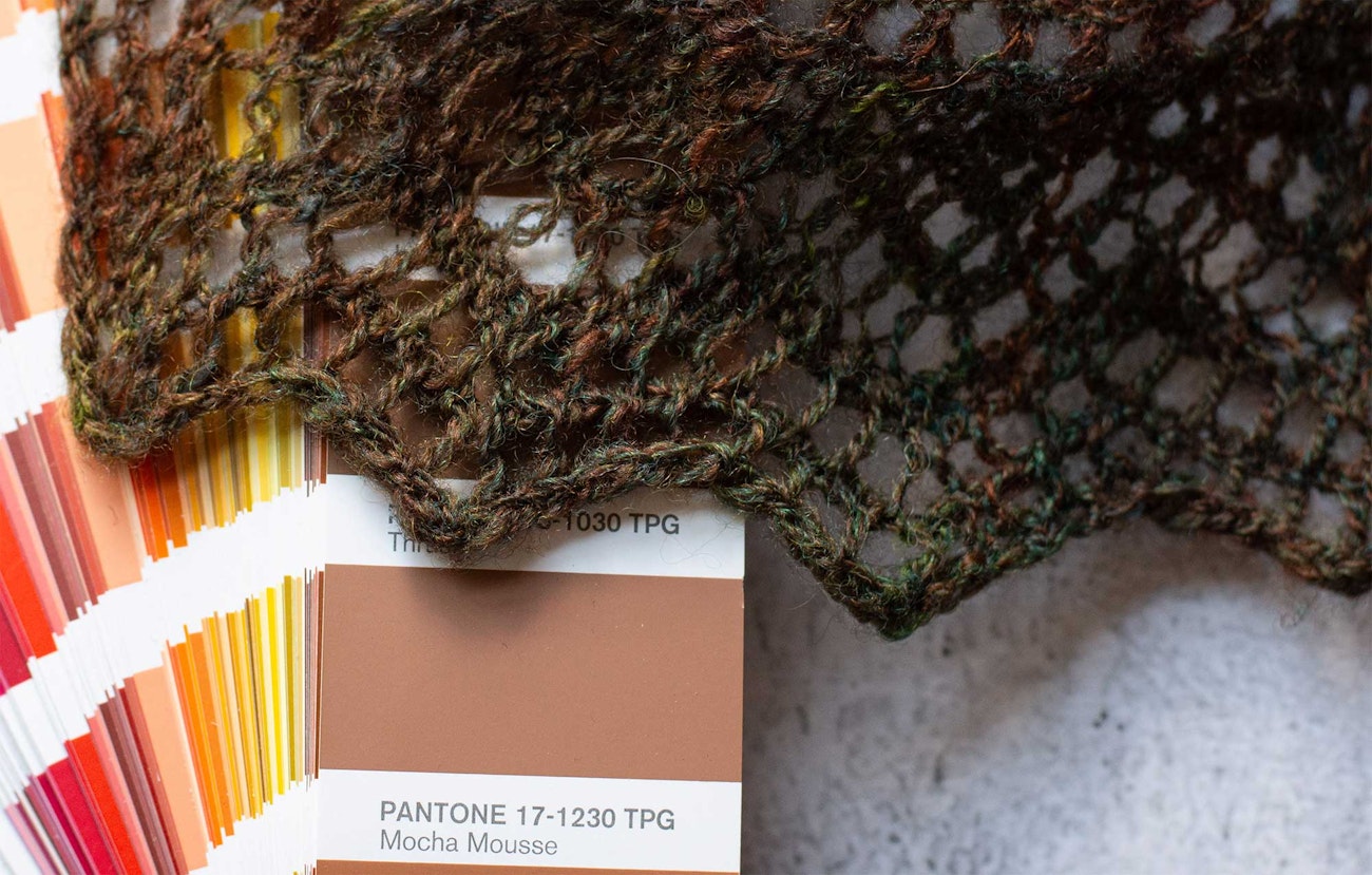 This year, coffee in hand, I hit refresh on my browser repeatedly, waiting for the color to be announced. It took a little bit of patience to discover that Pantone’s Color of the Year for 2025 is “Mocha Mousse,” a muted brown in the red-orange family. When I saw the screen fill with shades of brown and a decidedly unappetizing bowl of brown pudding, I was a little disappointed. But then I looked down at my creamy cup of coffee, and the brown sweater with colorwork in shades of cream and tan that I’d chosen for the day. Maybe Pantone was on to something!