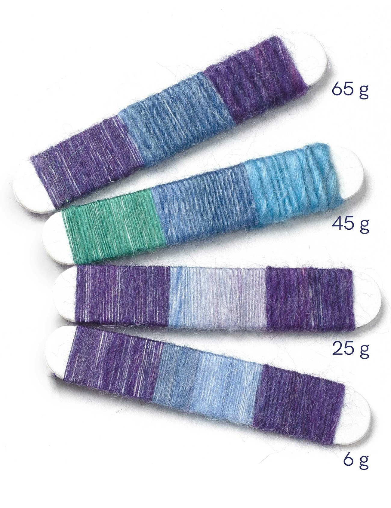 Each sample shows the thinnest, easiest, and thickest yarn to spin on each spindle from 65 g (top) to 6 g (bottom).