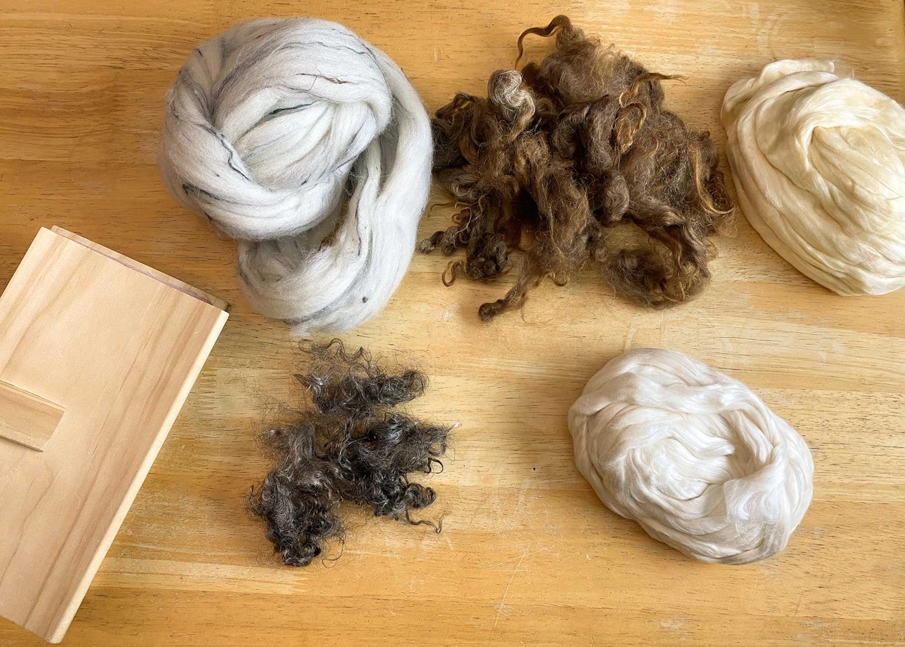 Choose fibers for your next spin. Top, from left: Shaniko wool/acrylic/nylon blend; Shetland fleece; Treenway Silks Nistari bombyx silk sliver. Bottom, from left: mohair; 55/45 bombyx silk/cotton sliver.