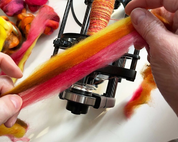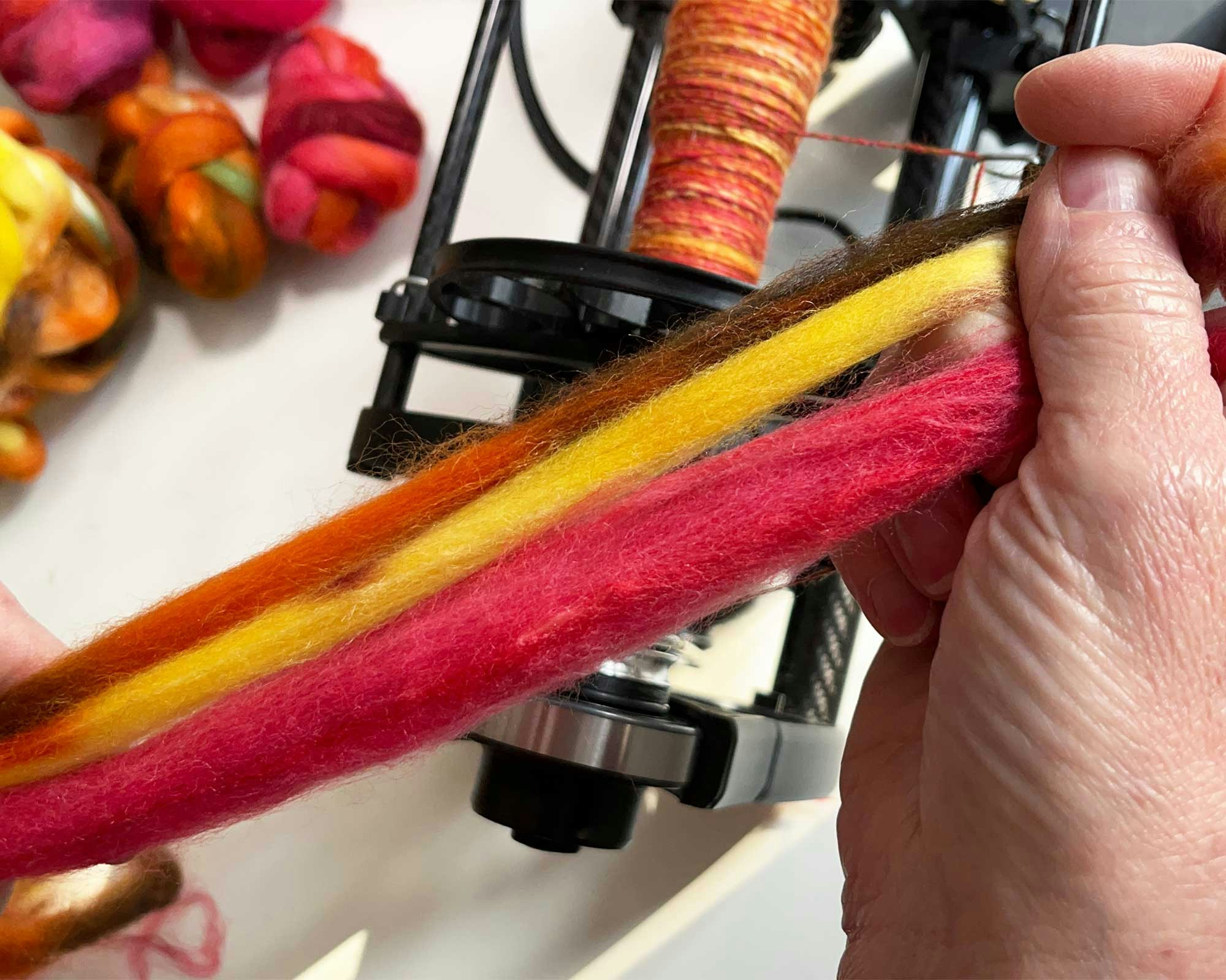 Combo plying is just at it sounds, though it’s often mislabeled as combo spinning at the outset by spinners who want to “combine” otherwise unrelated fibers or colorways. Here, different braids, batts, or rolags are each spun separately into individual strands, then plied together for more complex color and textural results.