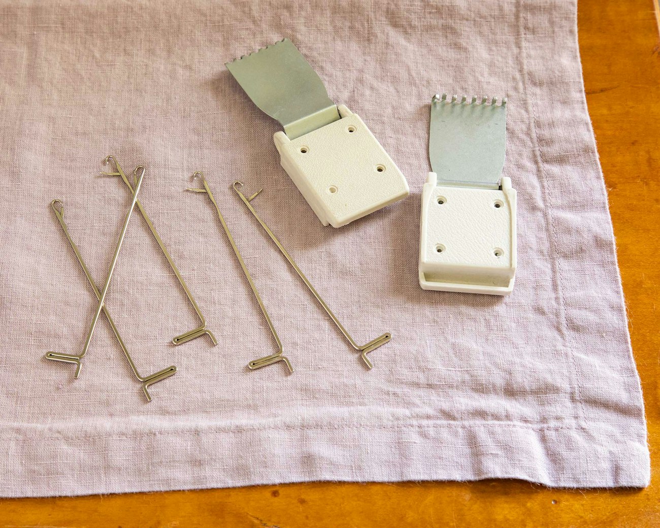 Knitting machine needles (left) look like latch hooks. Claw weights (right) keep the stitches properly situated on the needles.