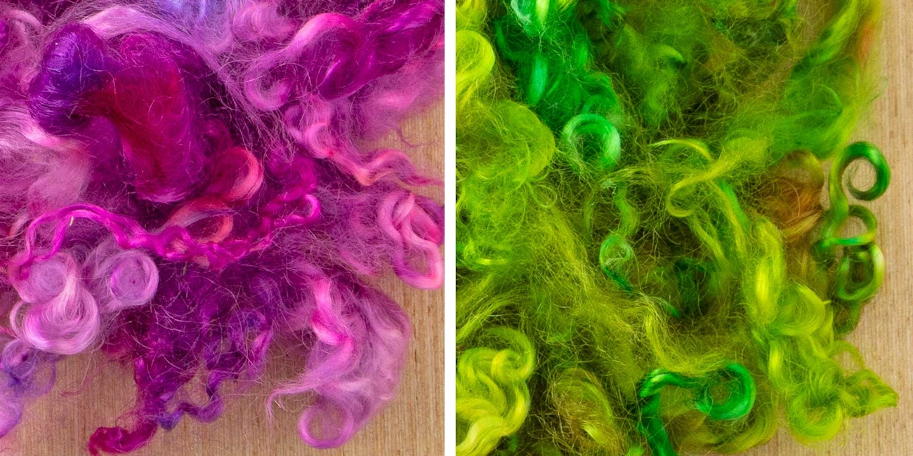After acquiring a box of curly Teeswater locks at a guild sale, I was interested in adding more texture and color to my handspinning accomplishments. Spinning the perfect, consistent yarn was no longer my priority. Using my locks to create a fine art yarn—that’s the ticket! I began thinking about an efficient dye technique to use for the yarns I was planning. I had seen more than a few videos on “breaking” acid dye colors on both roving and yarn. This method can be used to create more colors with fewer dye batches. But how would it work on Teeswater locks? I was ready to give it a try!