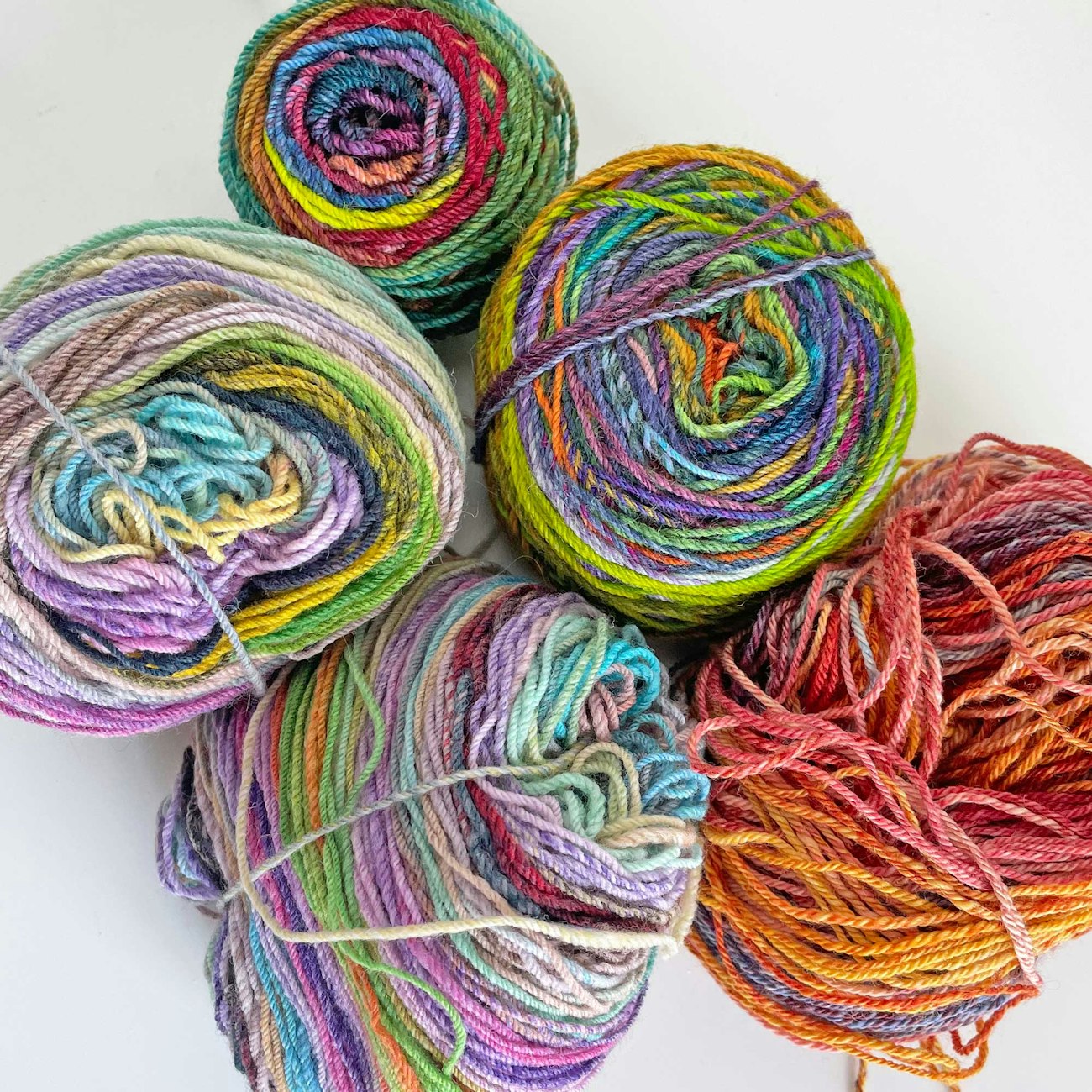 Yarns spun from “scrappy” fiber: sets of many separate bits of roving that dyers put together for supercolorful spins.