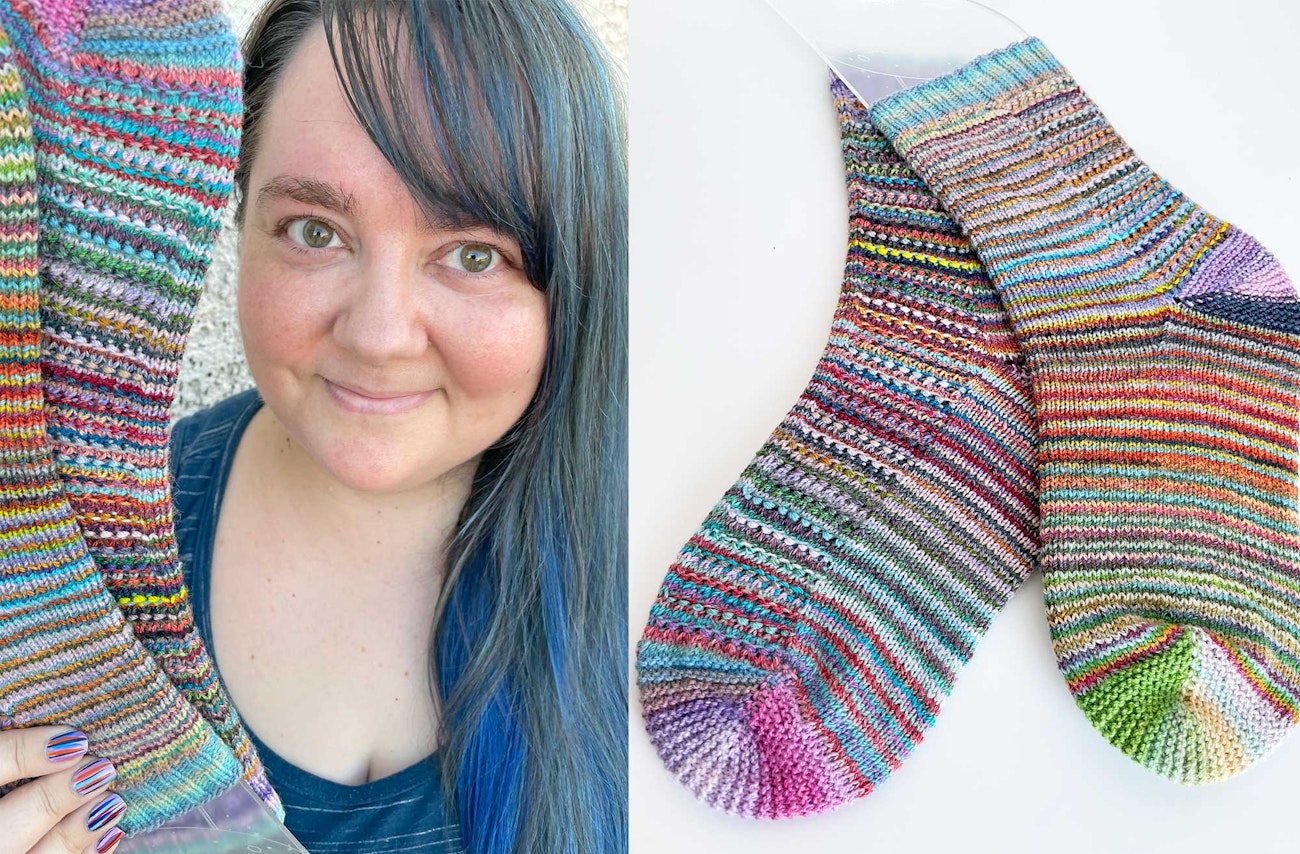For the cherry on top, I also love helical knitting, where yarns used for one-row stripes are not crossed at the beginning of the round, allowing each yarn to continue its spiraling path without a jog in the color. The Oddments pattern was written specifically for helical knitting and included a bit of texture for interest. I made one modification to add a mini gusset before and after the heels for a better fit, and another to add a few stitches in the total circumference. For the hundreds of socks that I have knitted, somehow this pair was the first with a garter-stitch heel and toe. I discovered I really enjoyed the faster rhythm of knitting them, and they feel cushy when worn.