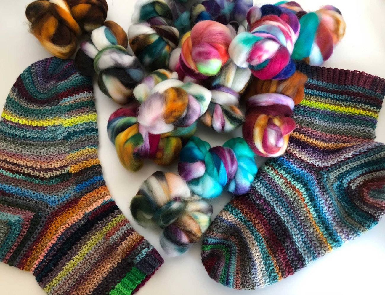 Fiber/preparation The leftovers from at least 13 different sock yarns went into this pair. All fibers were superwash, mostly Merino or Merino/nylon blend, but one was Targhee. Three of the yarns were spun by other spinners, including one by Micki of A Thing for String and two by Melody of Four Rivers Yarn and Fiber, but the rest of the yarns were my own handspun. All my spins for this project started in roving form. Typically, I separate the roving down the length of the fiber into strips and predraft thoroughly. Fiber dyers included Wound Up Fiber Arts, Sosae Caetano Yarn and Fiber, Woolen Mill St. Yarns, and Fully Spun. Not all the leftovers are from yarns that became other projects; several are from singles remaining on bobbins after plying a three-ply yarn, which I then chain-plied into a mini skein for these socks.