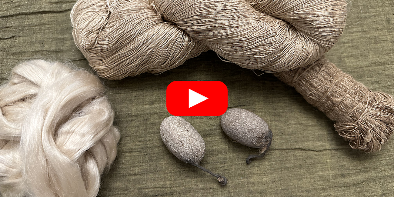 In episode one of her mini-series, Karen shares how she got started with silk and about the different qualities availaible, including noil (left), spun (center), and reeled (right).